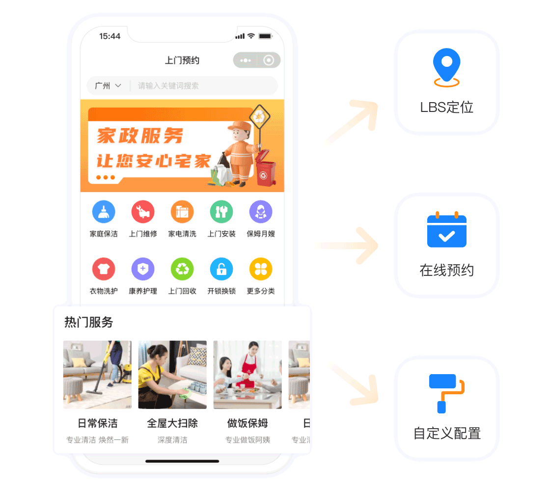 拥有强大的地图定位、在线预约、系统派单、后台派单、下单支付、核销订单等功能模块,用户端和师傅端完美融合,随时随地都能接单;可自定义预约时间段,无需排队,降低时间成本。